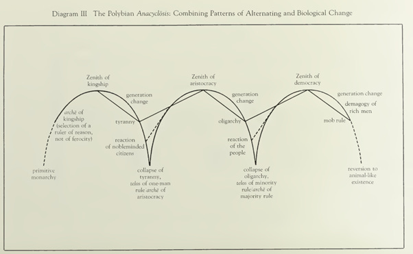 While writing The Prophets of Doom, it struck me several times, especially during the chapters on both Thomas Carlyle and Julius Evola, that Donald Trump and his MAGA movement are more truly liberal and truly democratic than their opponents. In other words, there are no truer believers in The Populist Delusion than the populists themselves. When Carlyle talks about the spirit of democracy as a spiral downwards and when Evola talks about involution as the inevitable consequence of American-style liberalism, it is difficult to picture the Davos set or even the decrepit incumbents of the Washington regime because these people do not embody the spirit of plebian energy ‘from below’ described by Carlyle or Evola. MAGA is a low-status ‘working people’s’ populist movement against a powerful, entitled and rich elite. If one considers the classic Anacyclosis as outlined by Polybius (see below), one can spot that the Trumpian figure comes after the oligarchy.